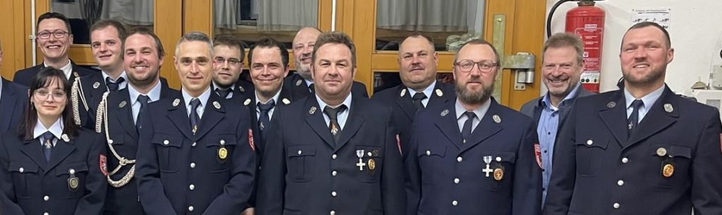 von links nach rechts: Fahnenabordnung Lorena Bayer, KBI Armin Daubenmerkl, Fahnenabordnung Michael Hellerbrand, Fähnrich Uli Amann, Vergnügungswart Sebastian Bayer, 2. Kommandant Matthias Graf, 2. Vorstand Philipp Strobl, 1. Vorstand Stephan Hartmann, Beisitzer Reinhard Amann, 1. Kommandant Richard Donhauser, Beisitzer Markus Ram, 1. Bürgermeister Alwin Märkl, Kassier Andreas Ram.